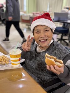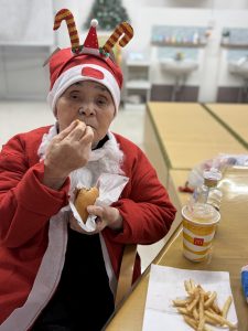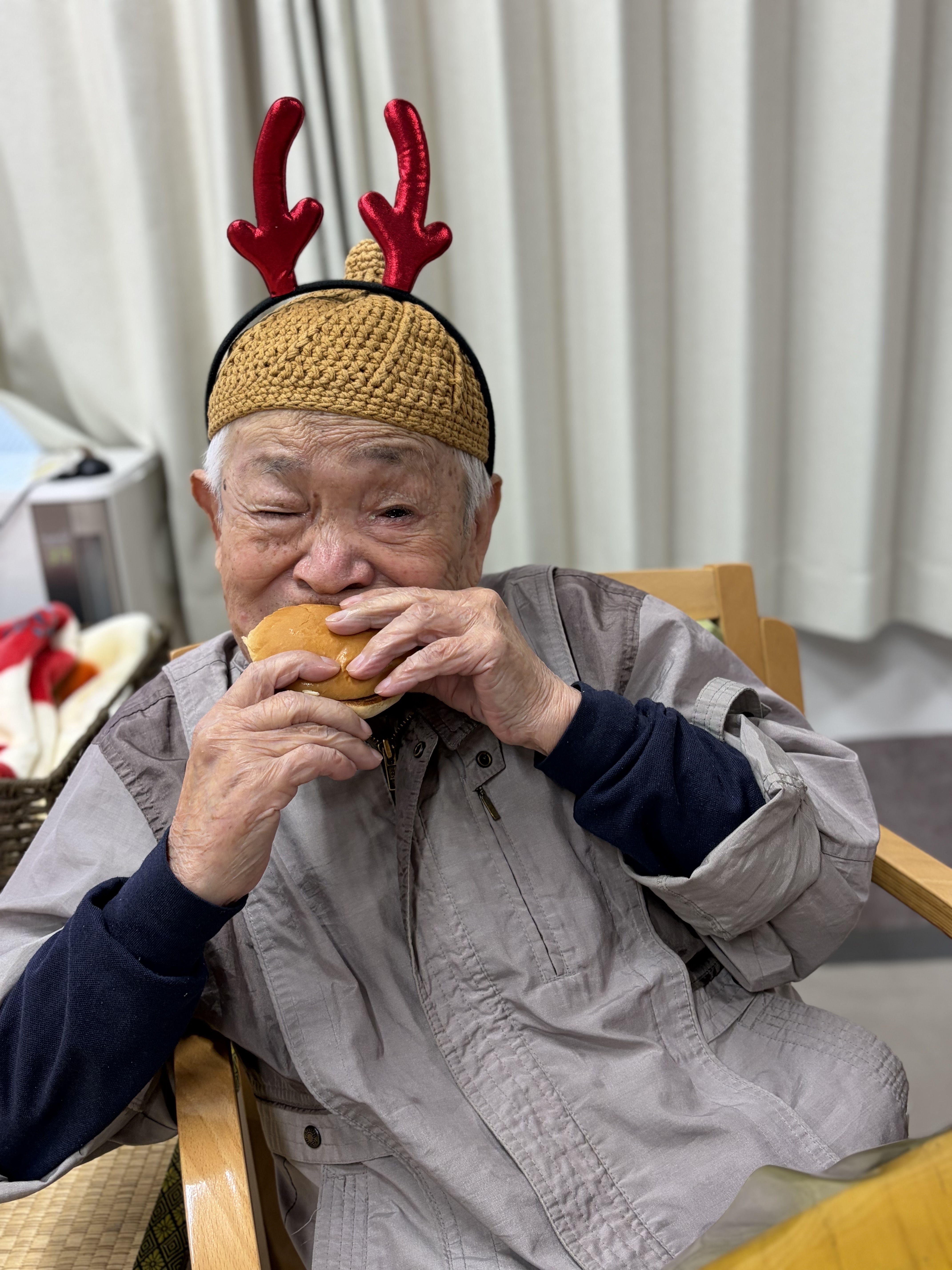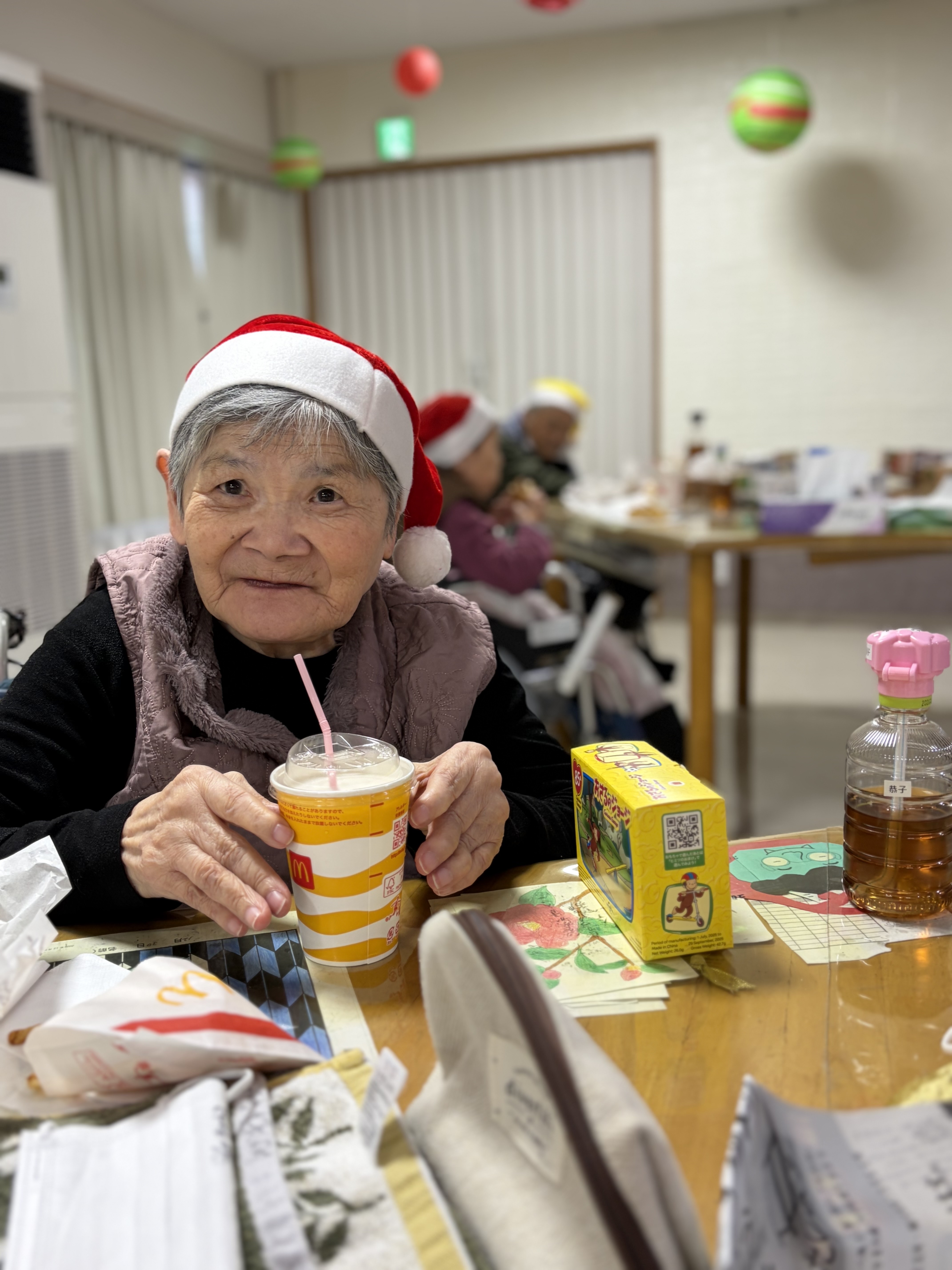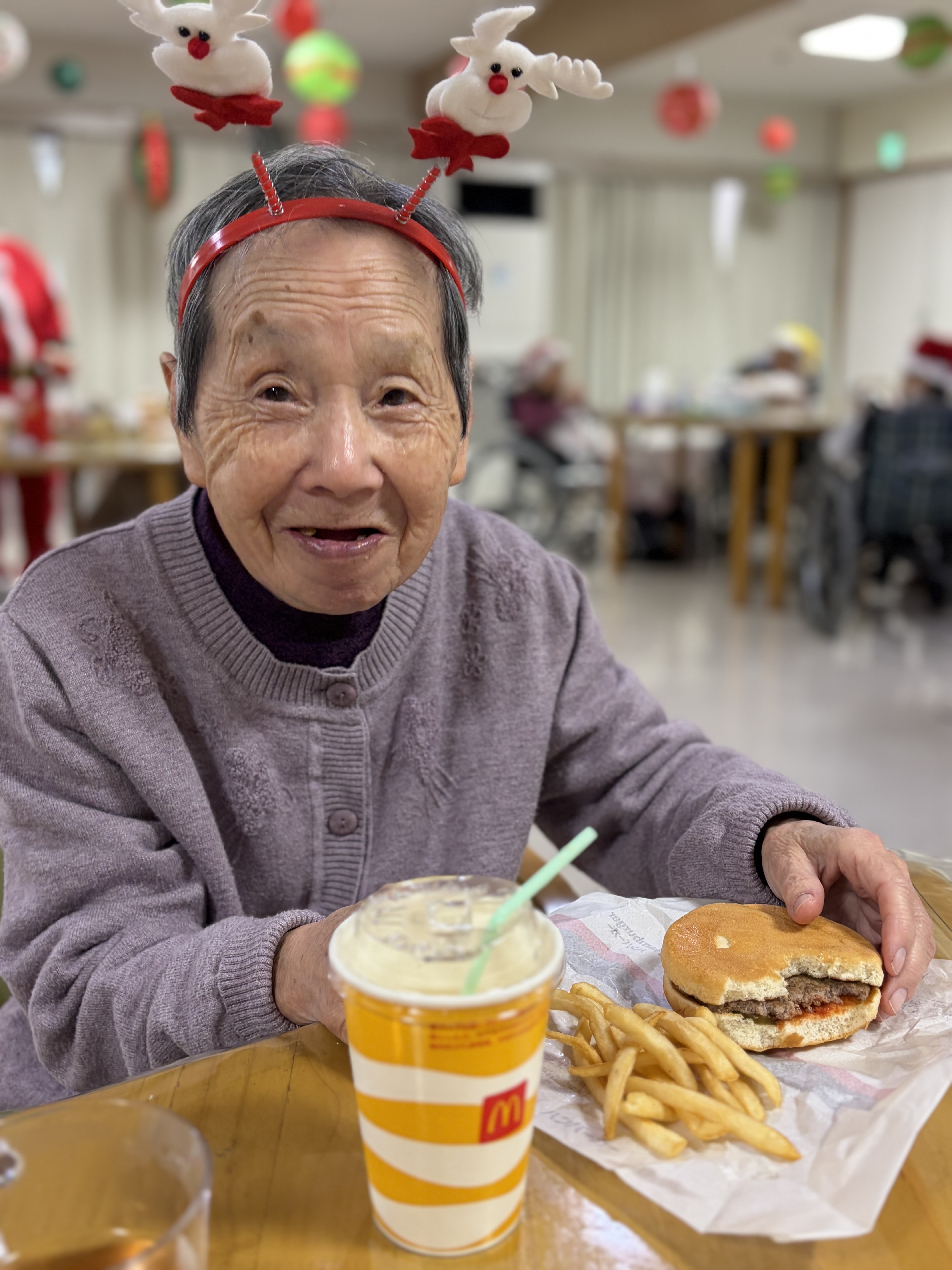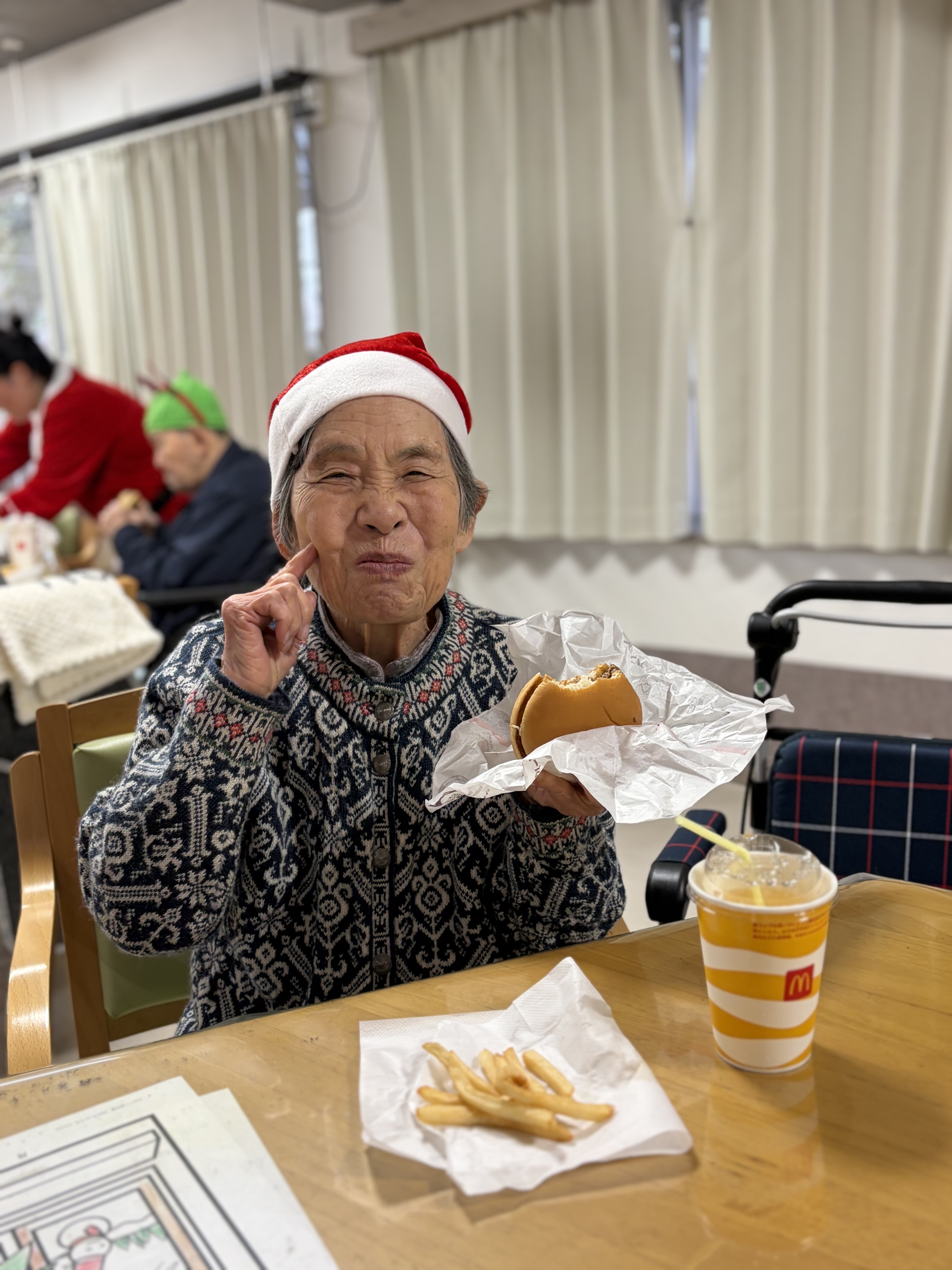 おやつにマック🍔 2025.12.24 カテゴリー:シルバーマンション 施設のすぐ近くにマクドナルドがオープン✨ いつか行きたい いつか食べたいと... 12/24にサンタさんと一緒に 買いにいきました🔔 皆さんの分を注文して テイクアウト 久しぶりに食べる ハンバーガー 美味しい😋 中には初めて 食べた方もおられます まだ食べたい また買ってきてと(*^_^*) 皆さん完食されていましたよ!