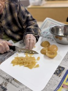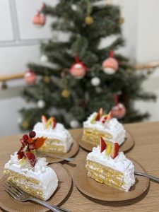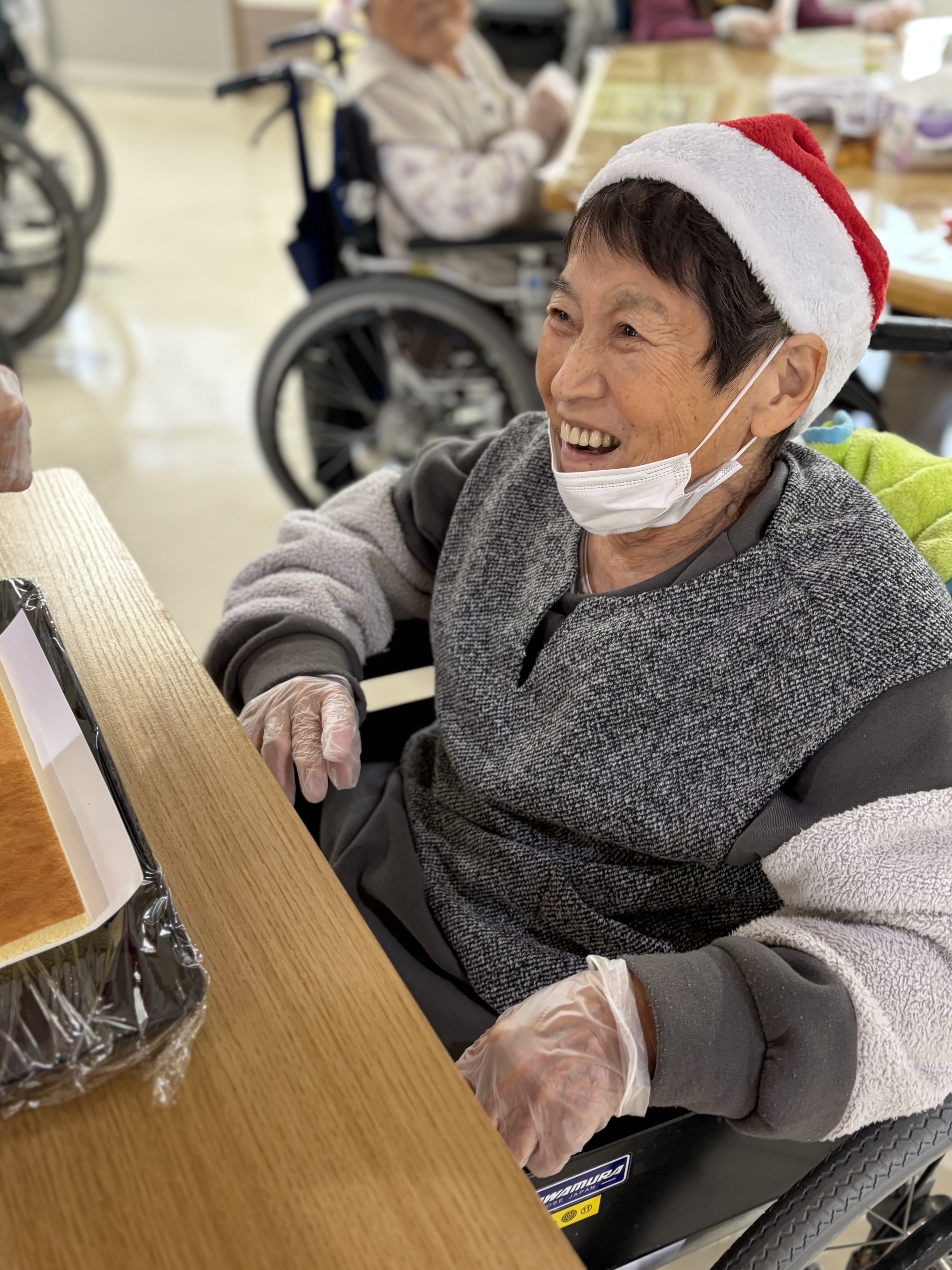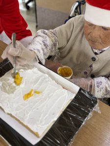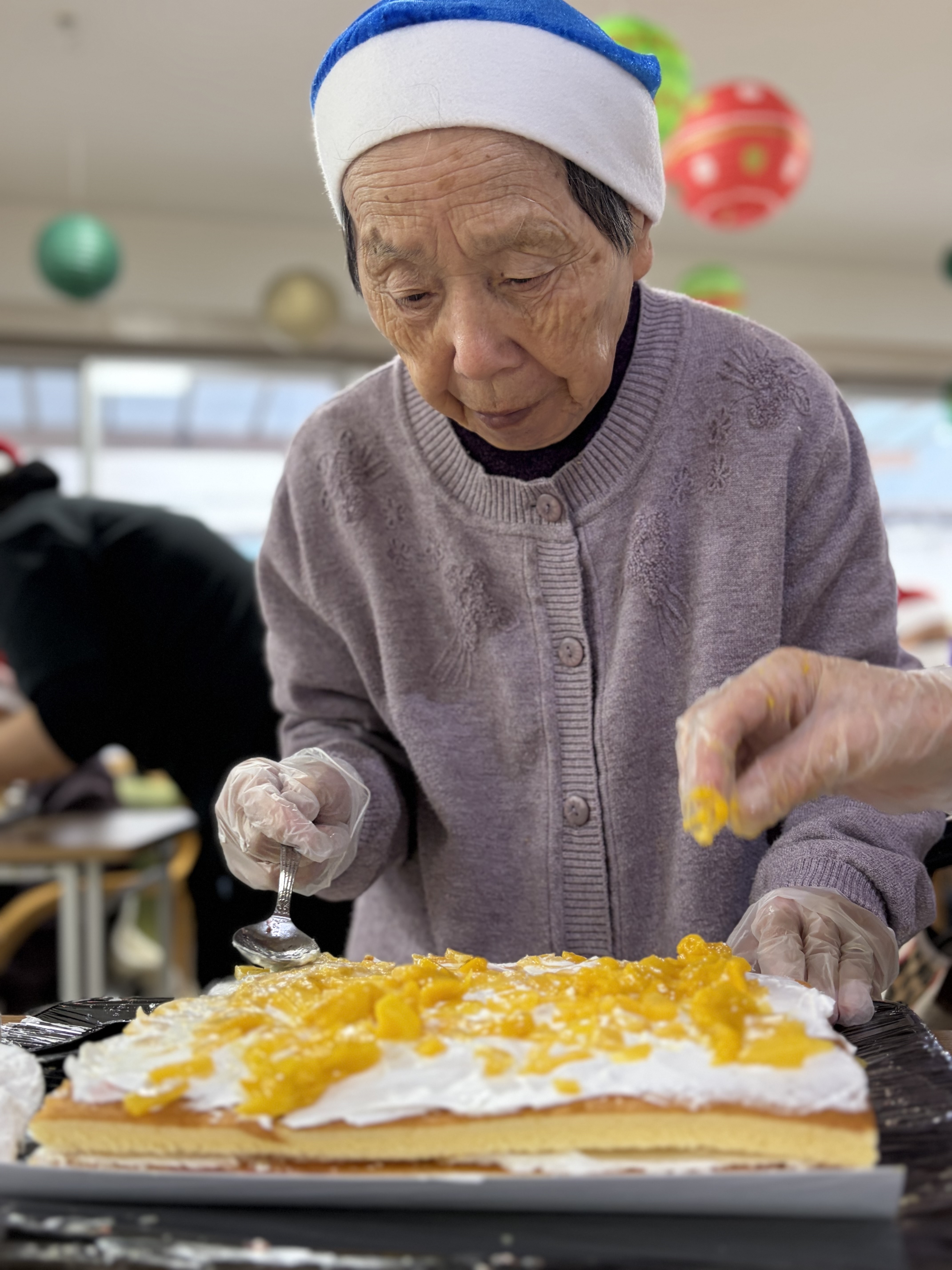 クリスマス会 2025.12.25 カテゴリー:シルバーマンション クリスマス会 をしました お昼のご飯も 豪華でした チキンライス・ハンバーグ・クリームホットパイ・オレンジゼリー 美味しかったです 今回は みんなでケーキをデコレーションする事に... 沢山の材料を切っていきます 上手に包丁も使えています スポンジに塗っていきます クリームたっぷり 果物たっぷり 真剣に ケーキ作り 甘い香りが広がっていました 美味しいケーキができました クリスマスの歌を歌って 楽しみました♬