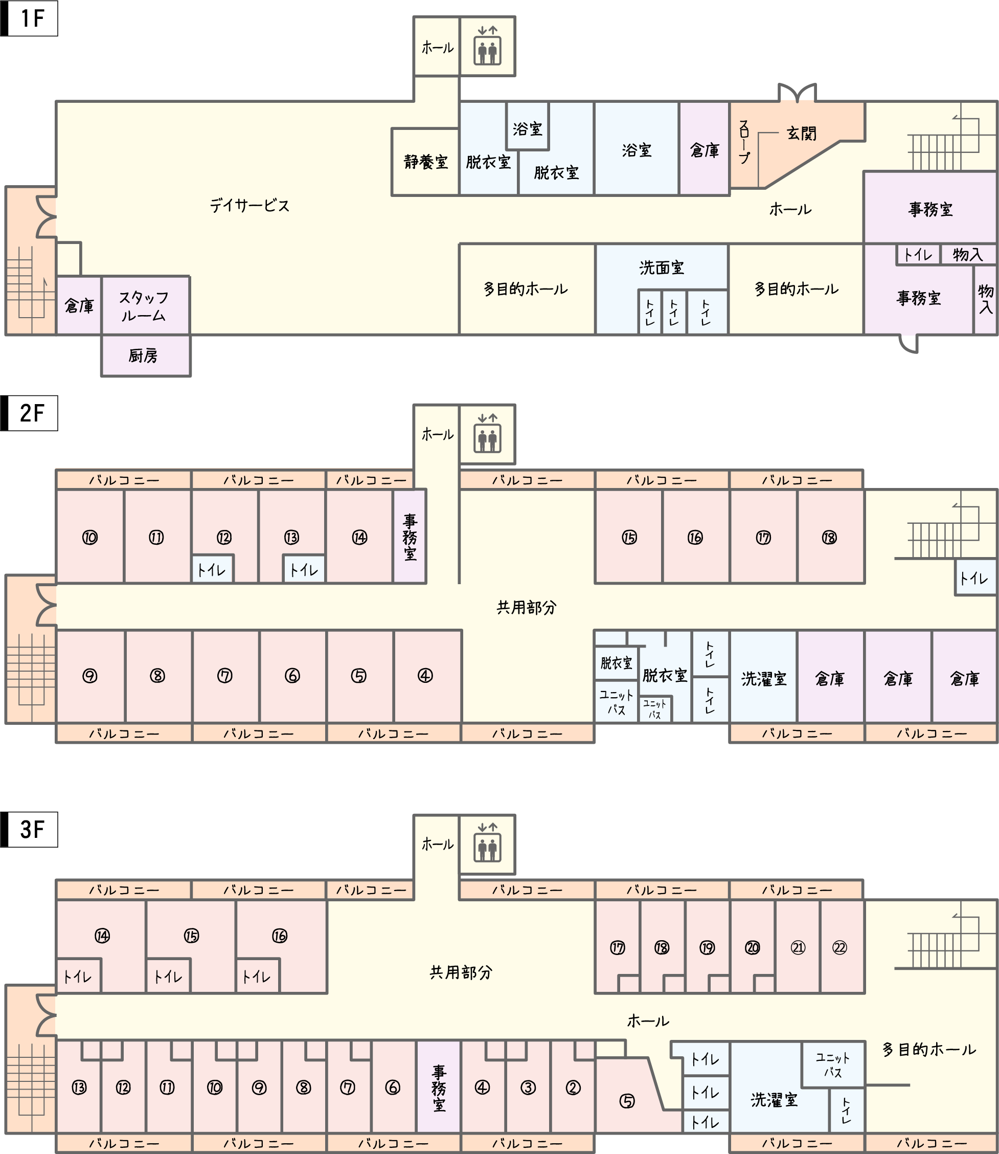 3階建て、全36室の鉄筋造です。2・3階には居室と浴室・洗面所・リビング等ゆったりとした生活を送っていただくための機能が備わっています。また、1階には訪問看護ステーションとデイサービスが併設しているため、各職員同士が情報を共有し入居者様の状態に合わせたサービスを提供可能です。 -